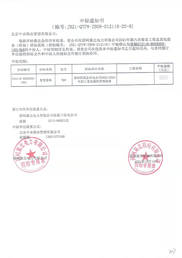 国网阳原县供电公司2022-2023年职工食堂管理项目成功中标