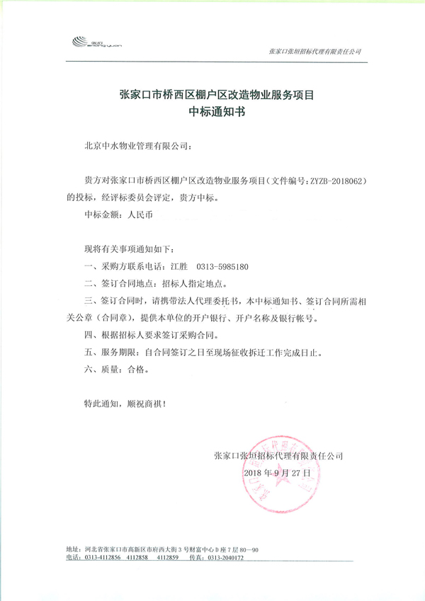 张家口市桥西区棚户区改造物业服务项目成功中标