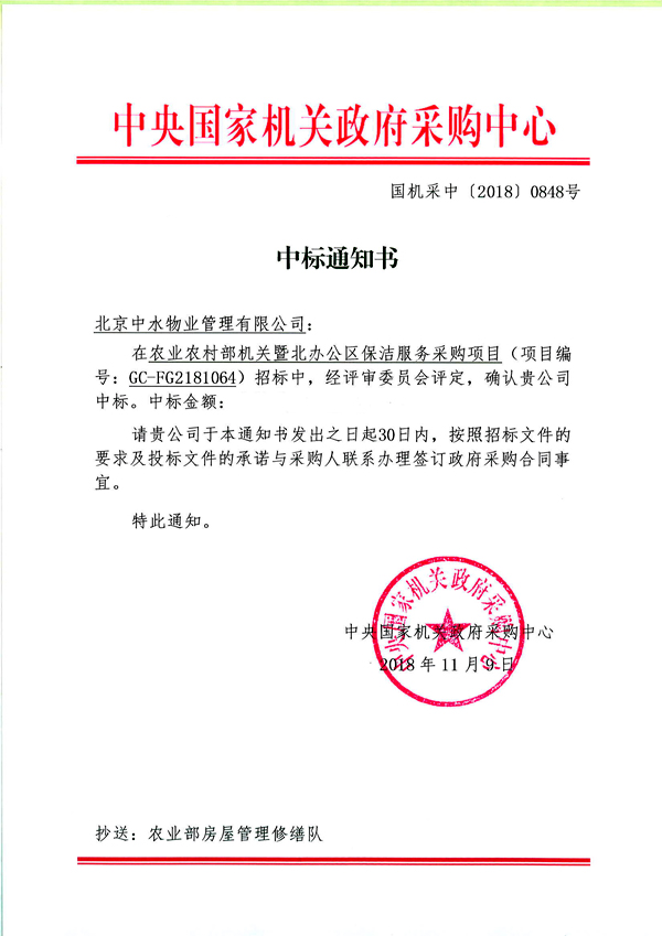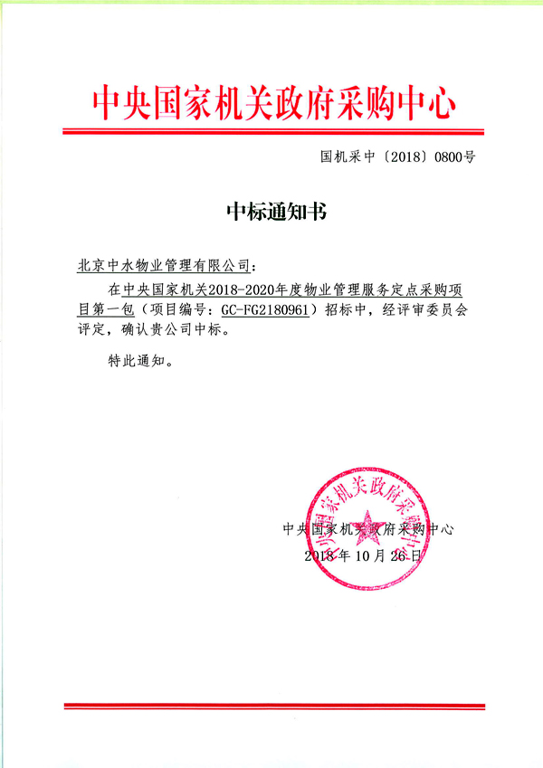 中央国家机关2018-2020年度物业管理服务定点采购项目第一包成功中标