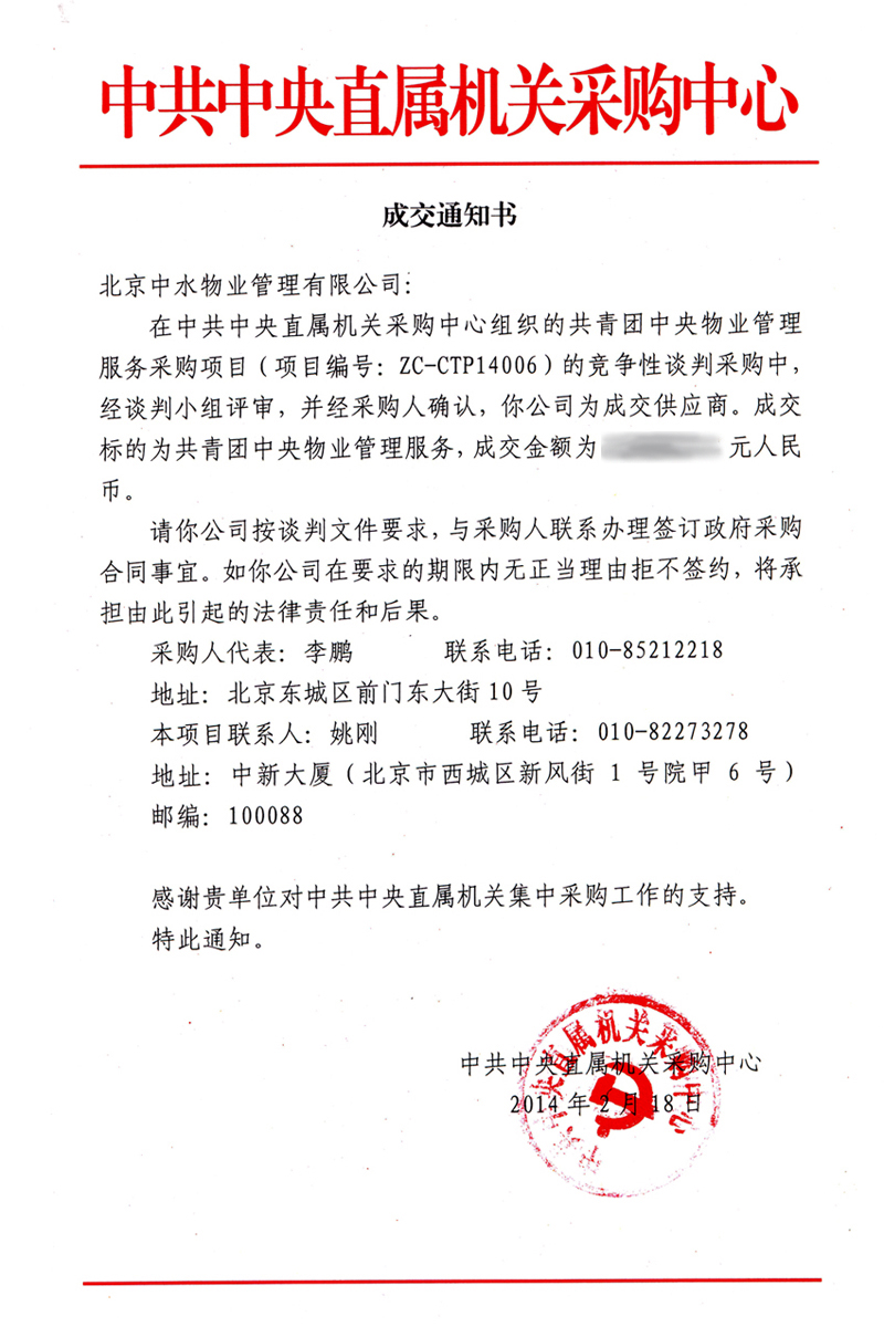 喜讯: 2014年3月19日中国劳动关系学院涿州校区物业管理服务采购项目成功中标
