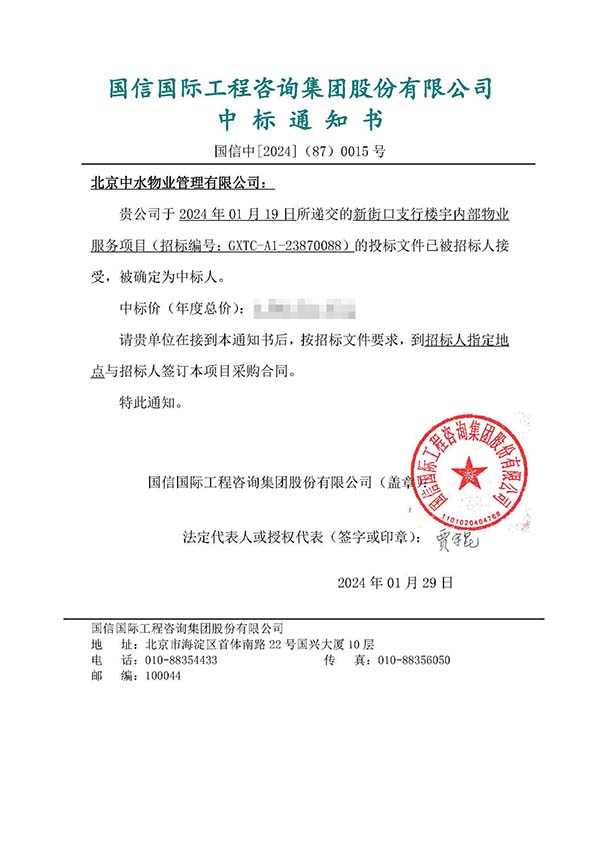中水物业成功中标北京自贸试验区国际商务服务片区支行楼宇内部物业服务项目