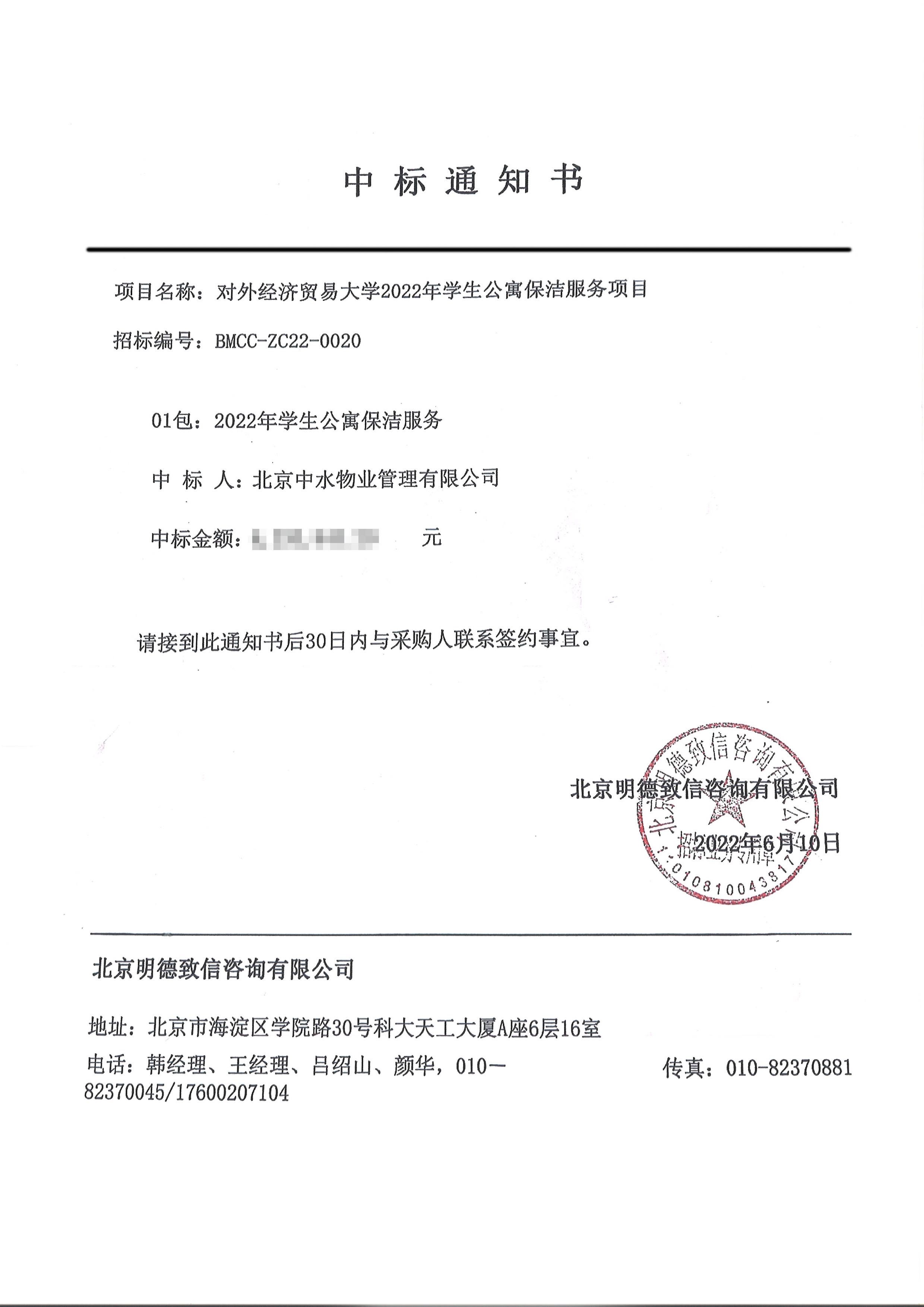 对外经济贸易大学2022年学生公寓保洁服务项目成功中标
