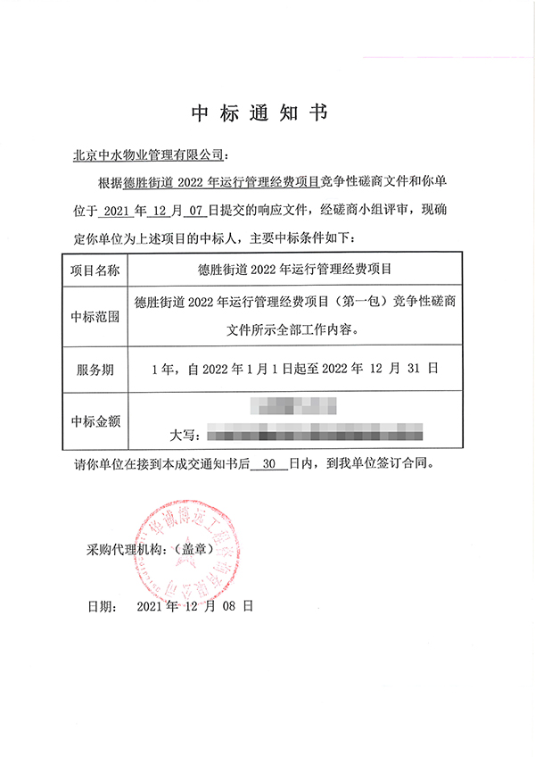 德胜街道2022年运行管理经费项目成功中标