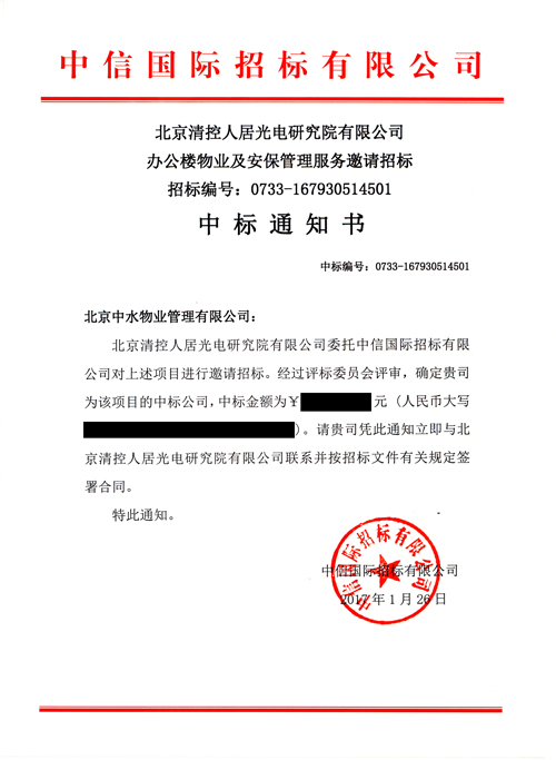 北京清控人居光电研究院有限公司办公楼物业及安保管理服务项目成功中标