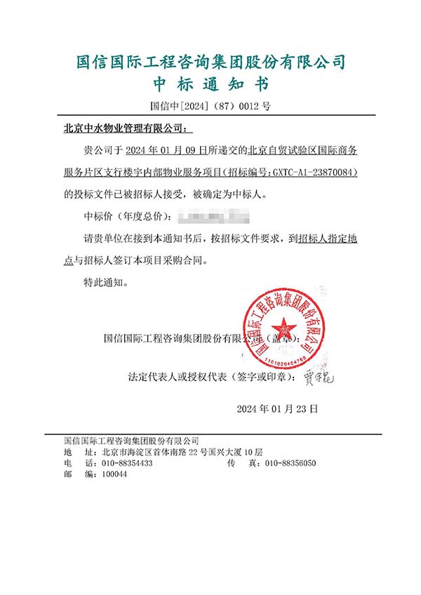 中水物业成功中标北京自贸试验区国际商务服务片区支行楼宇内部物业服务项目
